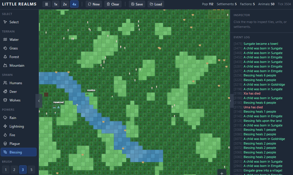 Little Realms is an experimental simulation/sandbox project built around map interaction, simple faction behaviour, spawning systems, terrain controls, and a light god-game feel. It is playful on the surface but driven by the more interesting question underneath: what happens when simple systems start interacting well enough to feel alive?